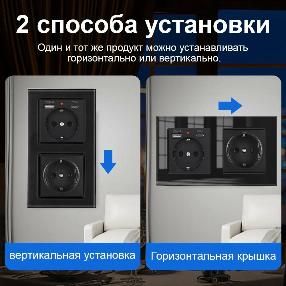 Отзывы на Розетка двойная с USB и type-C входами, 2 поста рамка закаленное стекло 153mm*82mm, цвет чёрный. F6