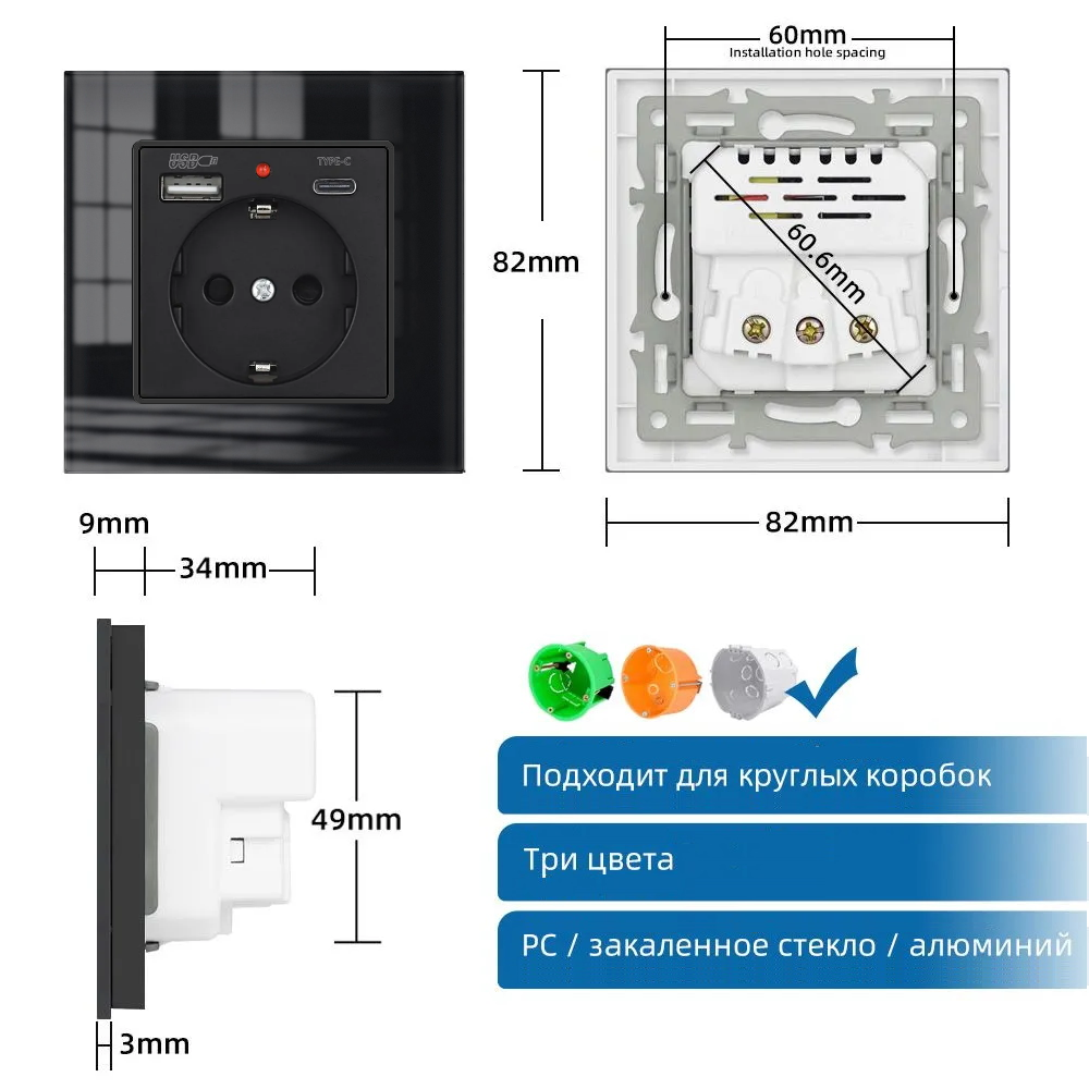 Розетка одинарная с USB и type-C входами, 1пост, рамка стекло 82mm*82mm, цвет чёрный. F6 информация: