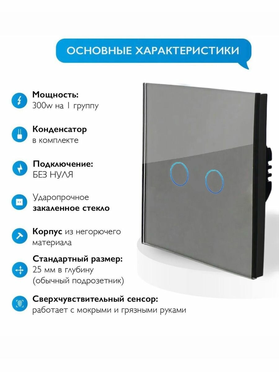 Выключатель сенсорный двойной, закаленная стеклянная панель, цвет-серый глянец, два поста. информация: