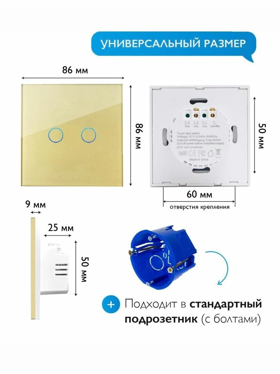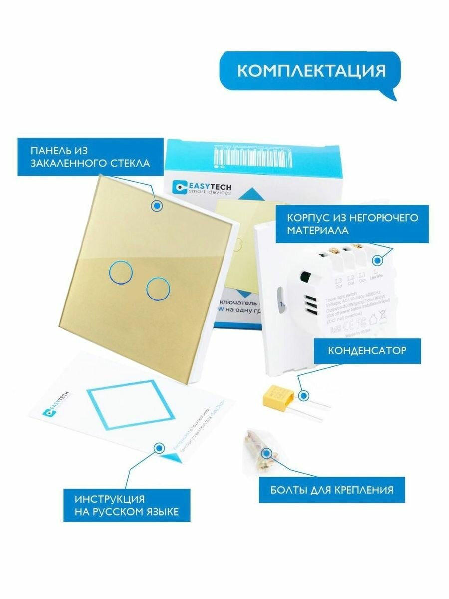 10 цен на Выключатель сенсорный двойной, закаленная стеклянная панель, цвет-золотой глянец, два поста.