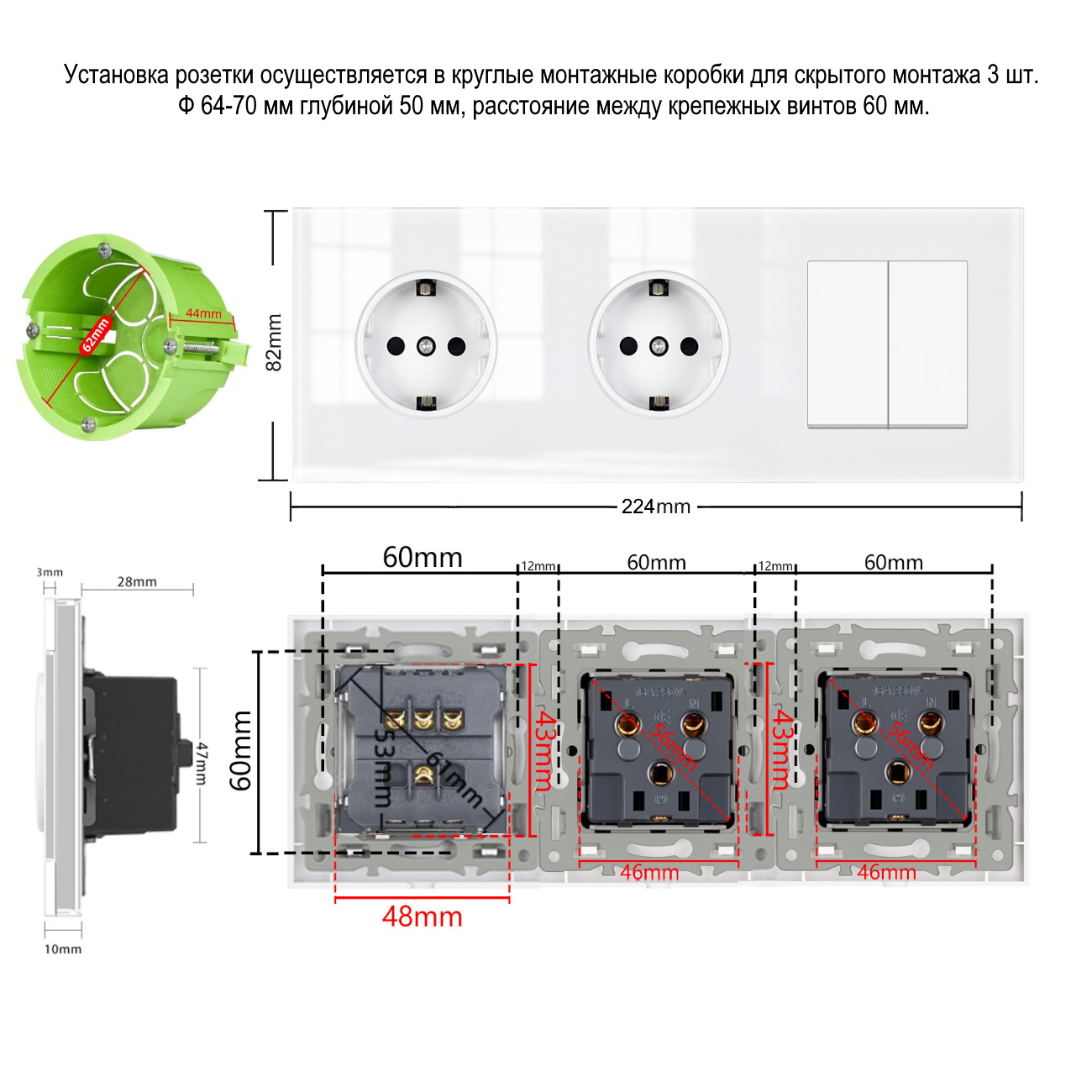 Отзывы на Двойная розетка с выключателем 2-клавишный, 3 поста, рамка стекло, цвет белый. F8
