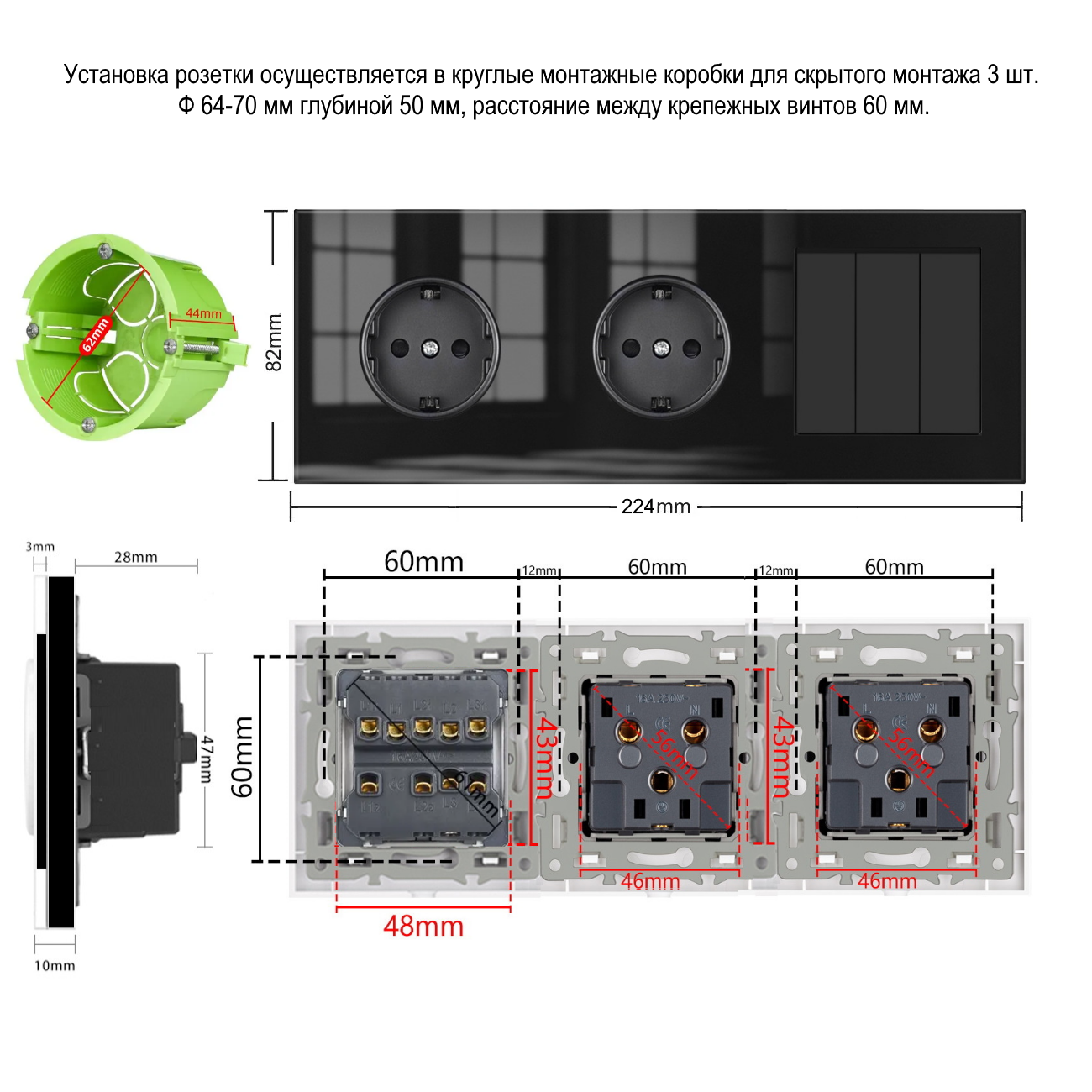 Отзывы на Трехклавишный выключатель с двумя розетками, 3 поста, 3 клавиша 2 розетки, рамка стекло 224*82*35mm. Чёрный. F8