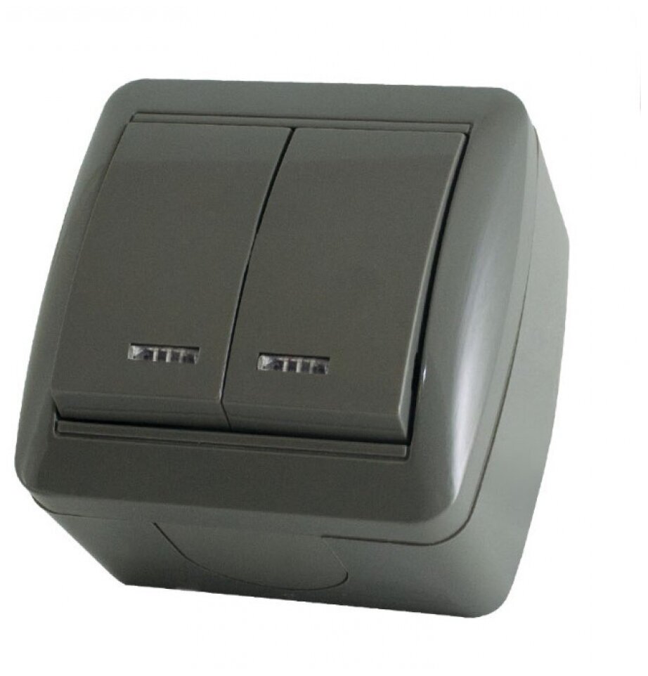Выключатель 2-кл. открытой установки с подсветкой IP44 10А серый "Селигер" TDM информация:
