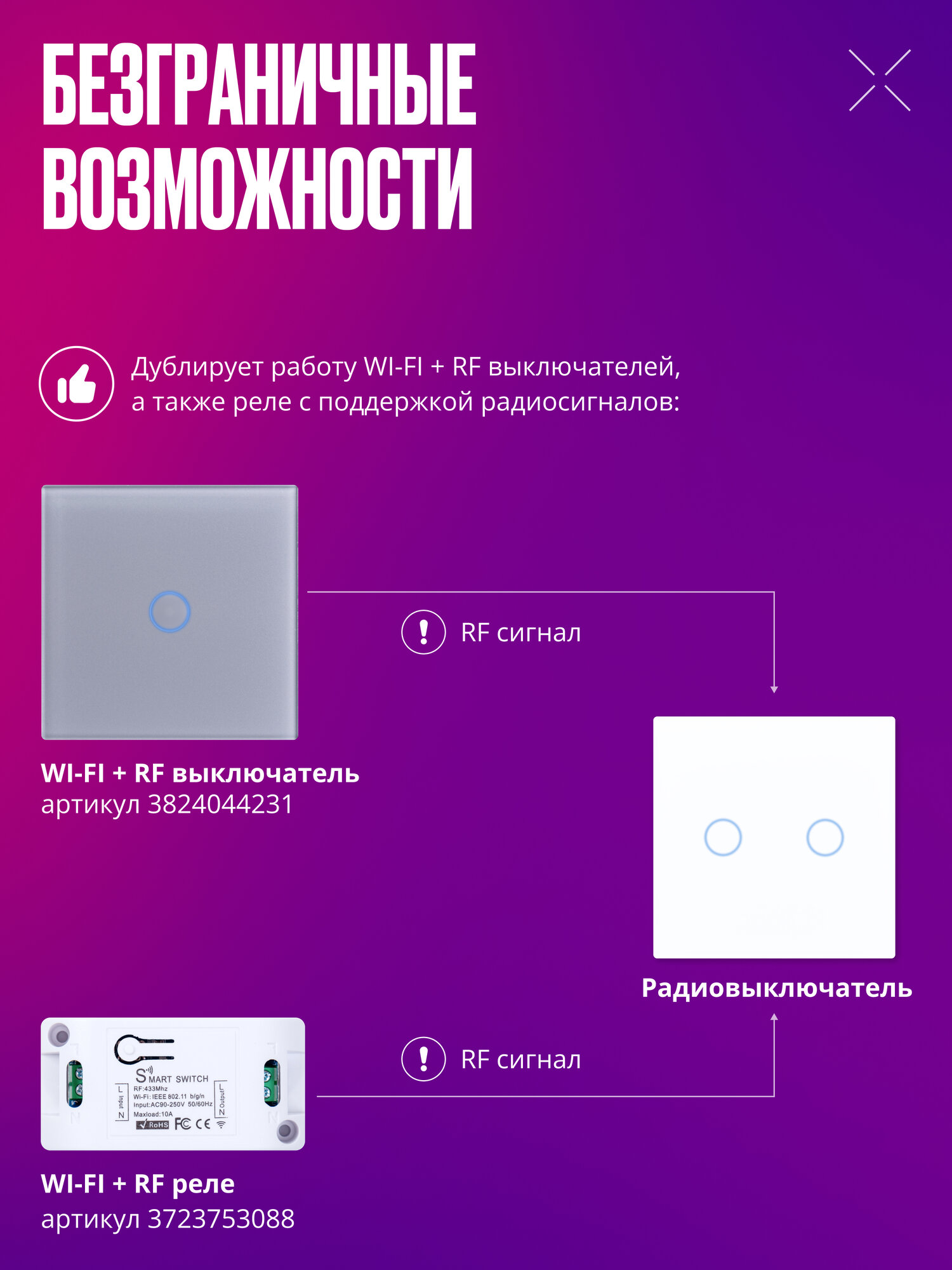 Отзывы на Повторитель сенсорный умного выключателя RF 433 Mhz стеклянный на батарейках двухклавишный, белый