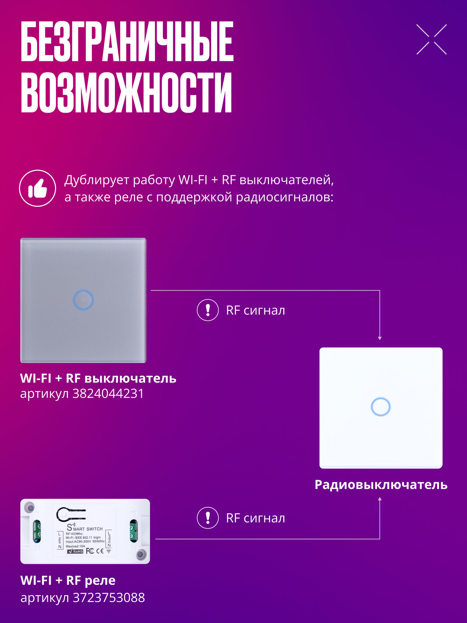 Отзывы на Повторитель сенсорный умного выключателя RF 433 Mhz стеклянный на батарейках одноклавишный, белый