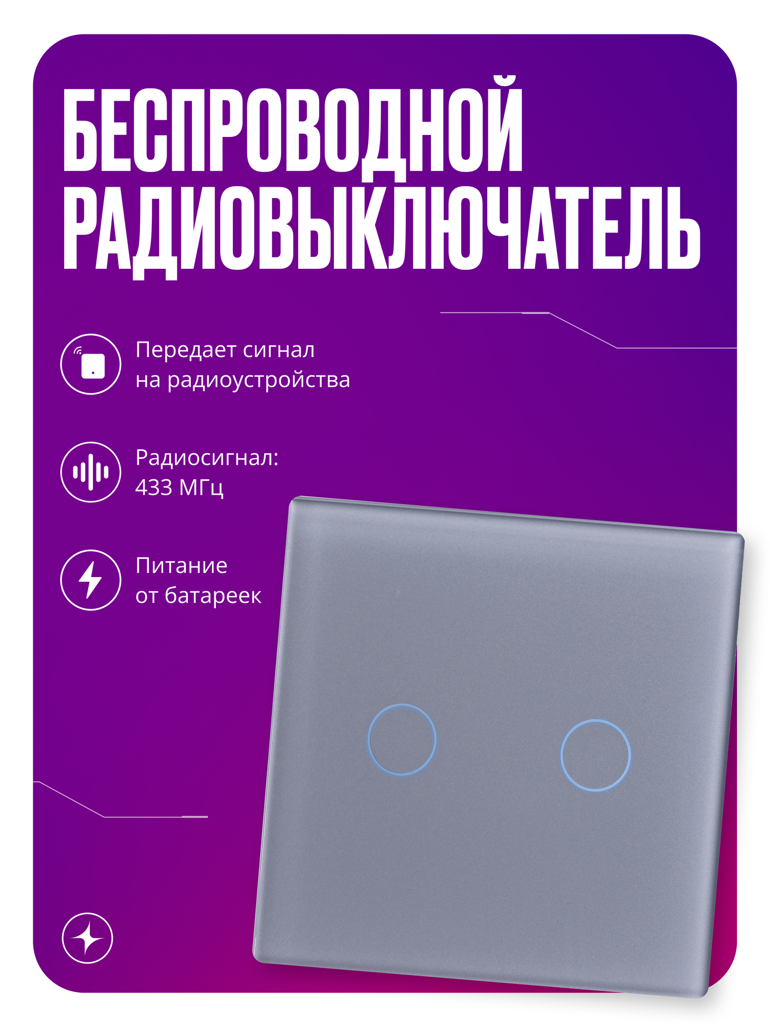 Отзывы на Повторитель сенсорный умного выключателя RF 433 Mhz стеклянный на батарейках двухклавишный, серый