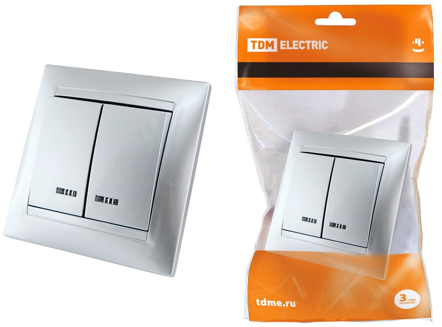 Выключатель 2 кл. с подсветкой 10А серебр. металлик "Лама" TDM информация: