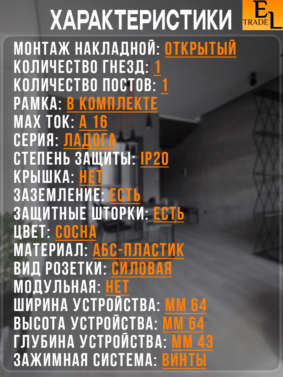 Розетка открытой установки с защитными шторками и заземлением сосна, 2П, IP20, 16А, Ладога информация: