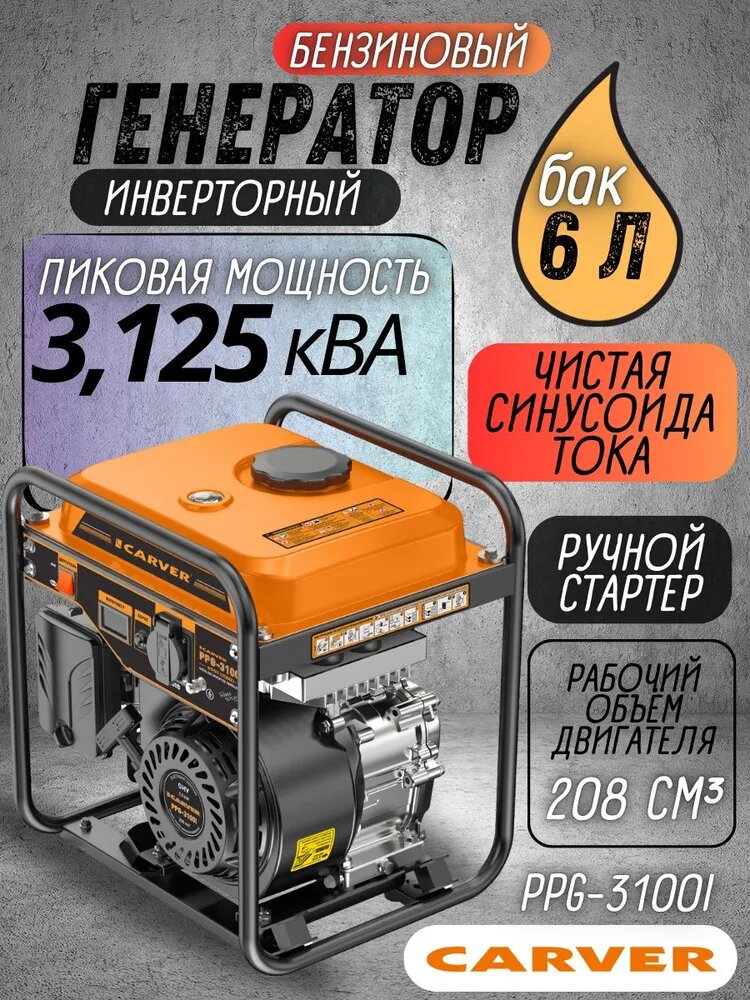 Генератор бензиновый CARVER PPG-3100i инверторный (2.5 кВт, AVR, 230 В, бак 6 л, объем двигателя 208 куб. см) информация: