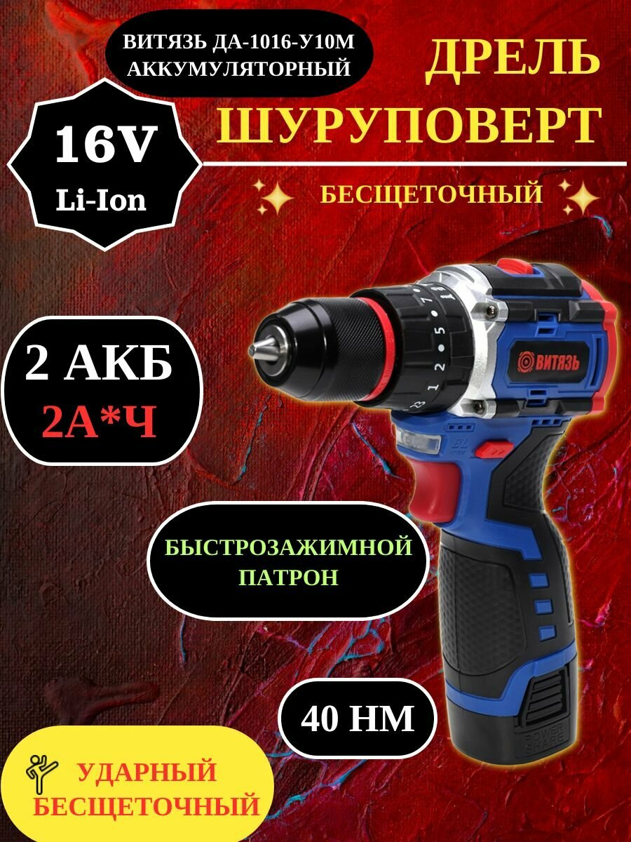 Дрель шуруповёрт Витязь ДА-1016-У10М БСП, Li-ion, 16В, 2 аккумулятора, быстросъёмный патрон 6 378 ₽