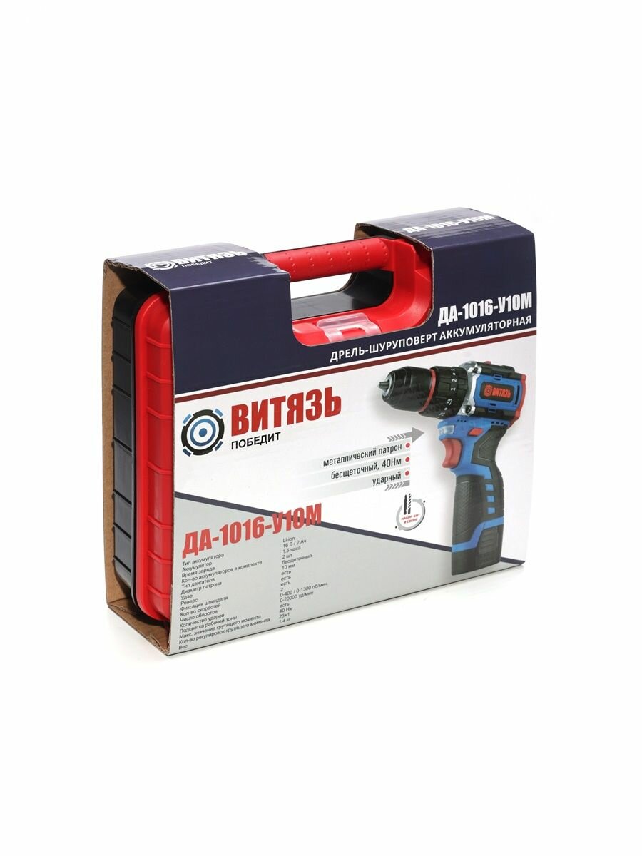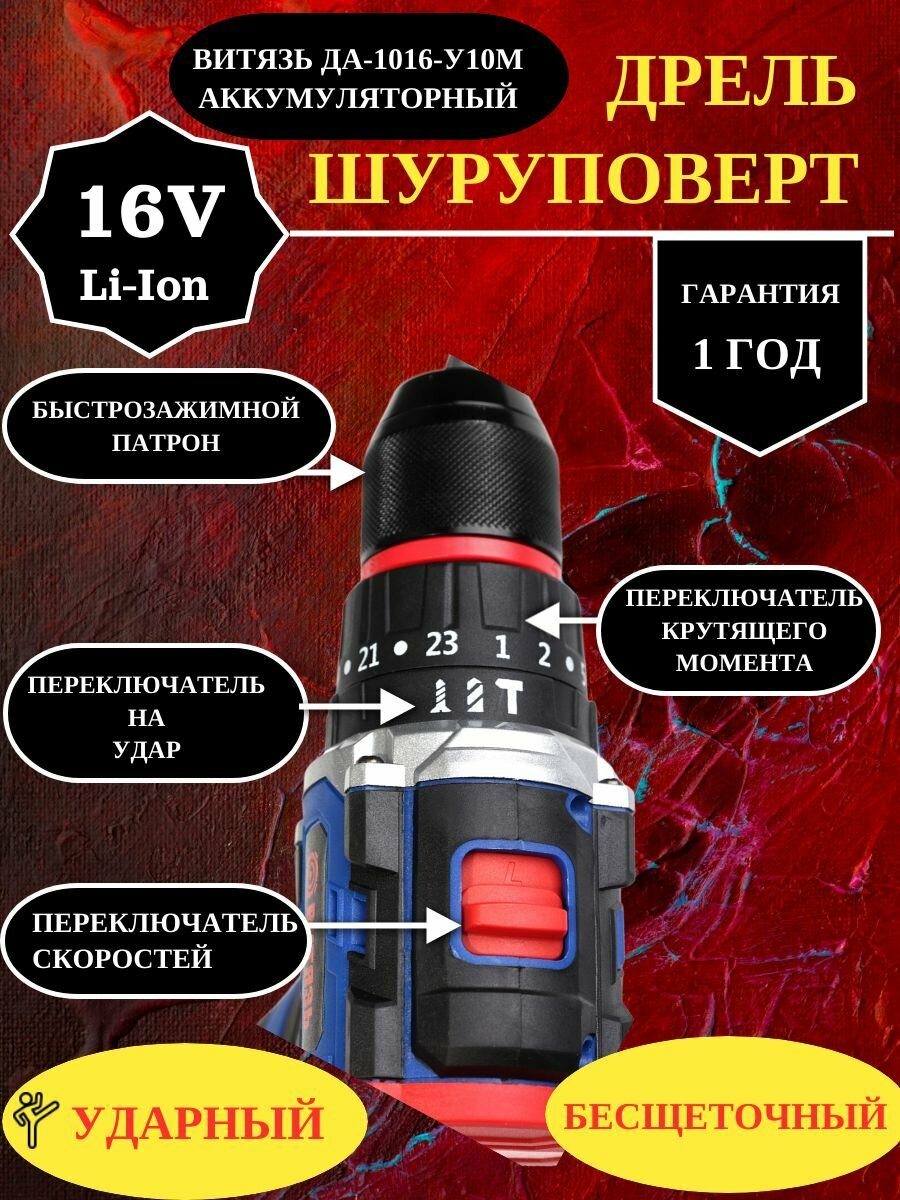 Дрель шуруповерт с быстрозажимным патроном Витязь ДА-1016-У10М, 16В, LiIon, в кейсе, 2 акк, 2 скор, подсветка информация:
