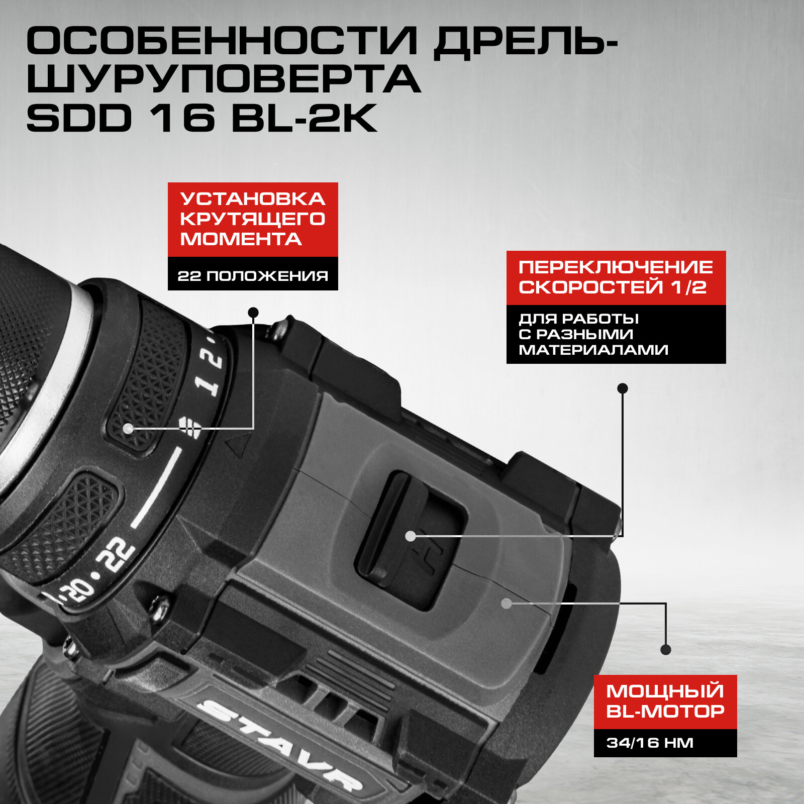 Дрель-шуроповерт STAVR SDD 16BL-2K, 16В, Li-Ion, 2Ач, 34Нм, 1450об/мин информация: