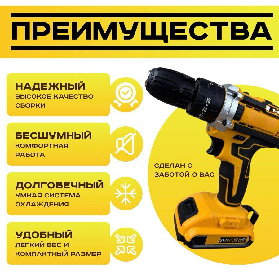 Шуруповерт аккумуляторный 21V, 2 АКБ, Дрель-шуруповерт с набором инструментов информация: