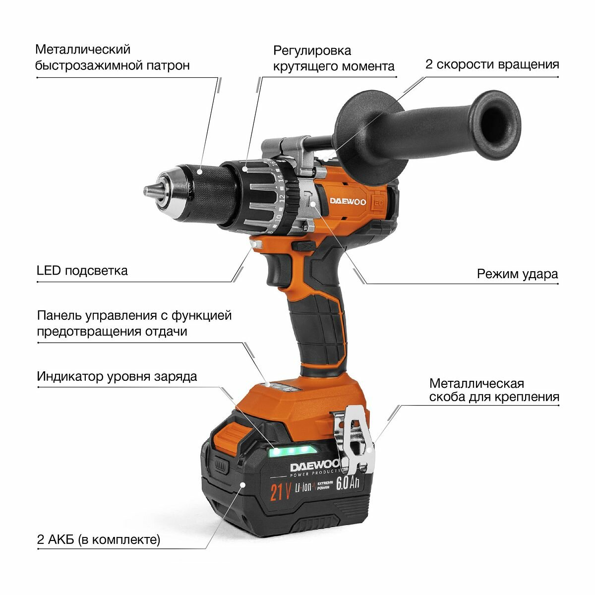 Дрель-шуруповерт ударная аккумуляторная DAEWOO DAA 2161Li с 2 АКБ 4/6 Ач и ЗУ информация: