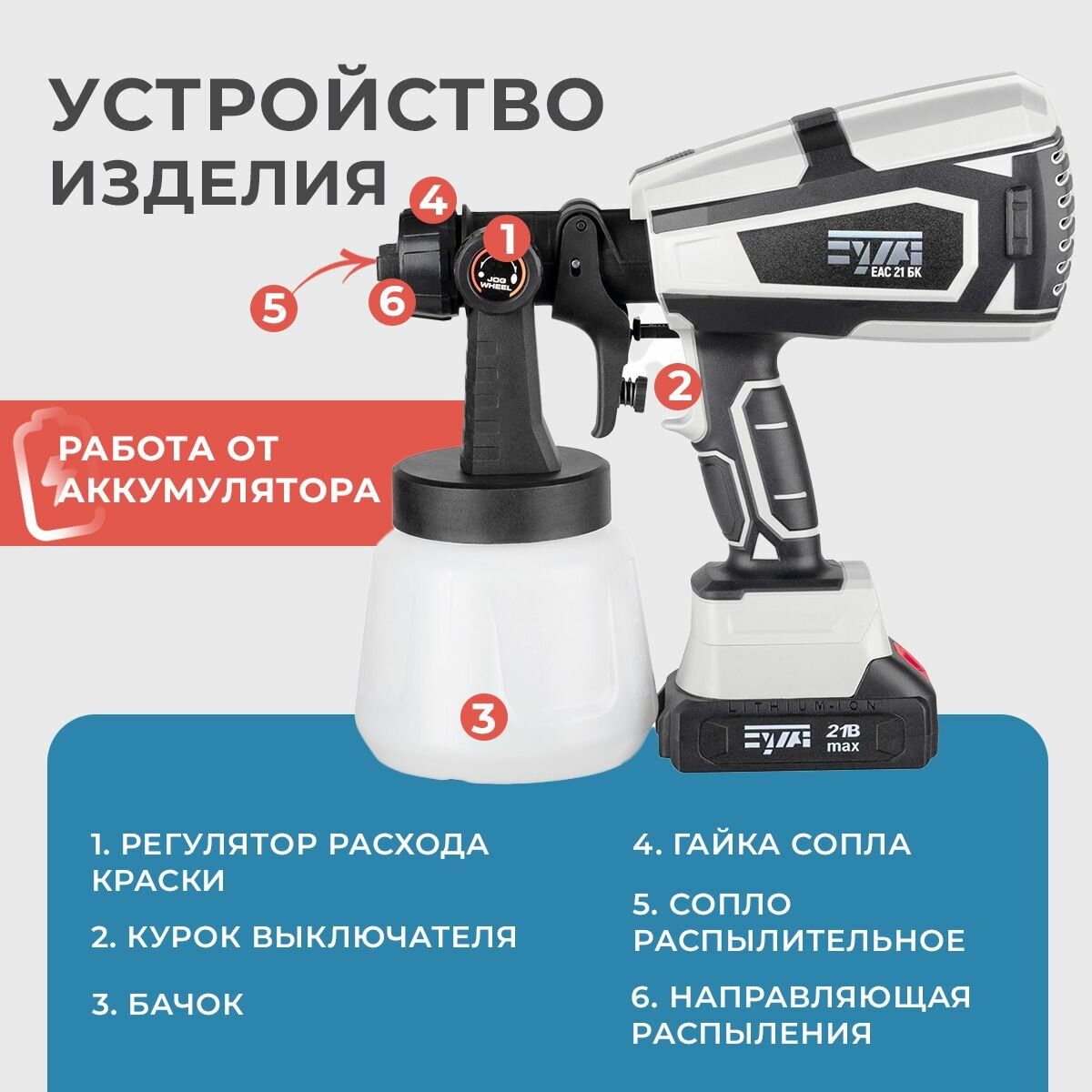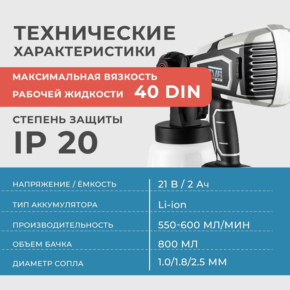 Краскопульт аккумуляторный EWA ЕАС21БК, 21В, 800мл, АКБ 2 Ач Li-ion информация: