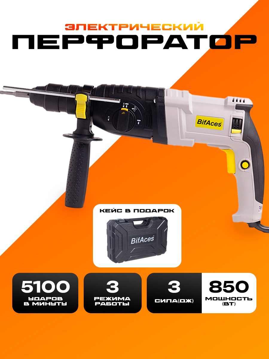 Перфоратор BifAces 850Вт, сила удара 3 Дж, скорость вращения 1150 об/мин, частота 5100 уд/мин. информация: