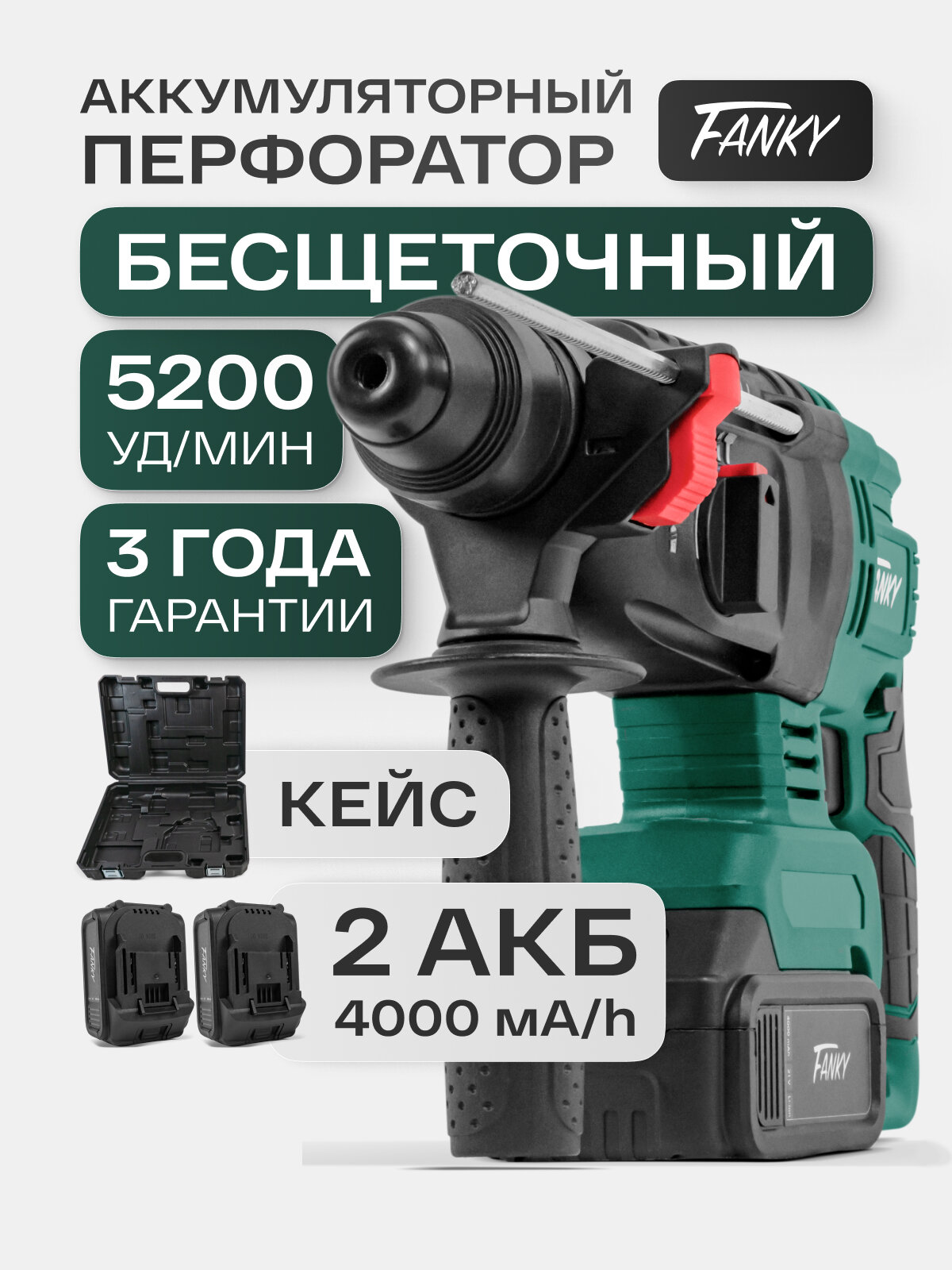 Отзывы на Перфоратор аккумуляторный Fanky бесщеточный 2 АКБ в кейсе, профессиональный с режимом долбления, SDS - plus, зеленый