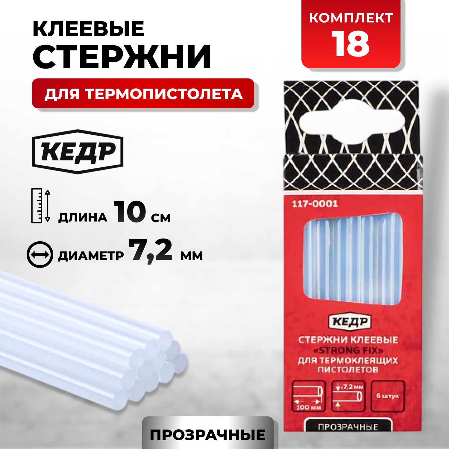 Стержни клеевые 7,2х100 мм 18 штук (3 упак по 6 шт) для термоклеящих пистолетов Кедр информация:
