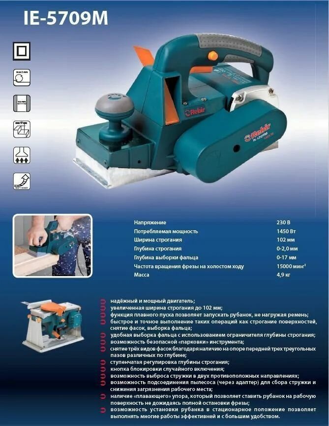 Рубанок электрический REBIR IE 5709M с металлическим стационаром информация: