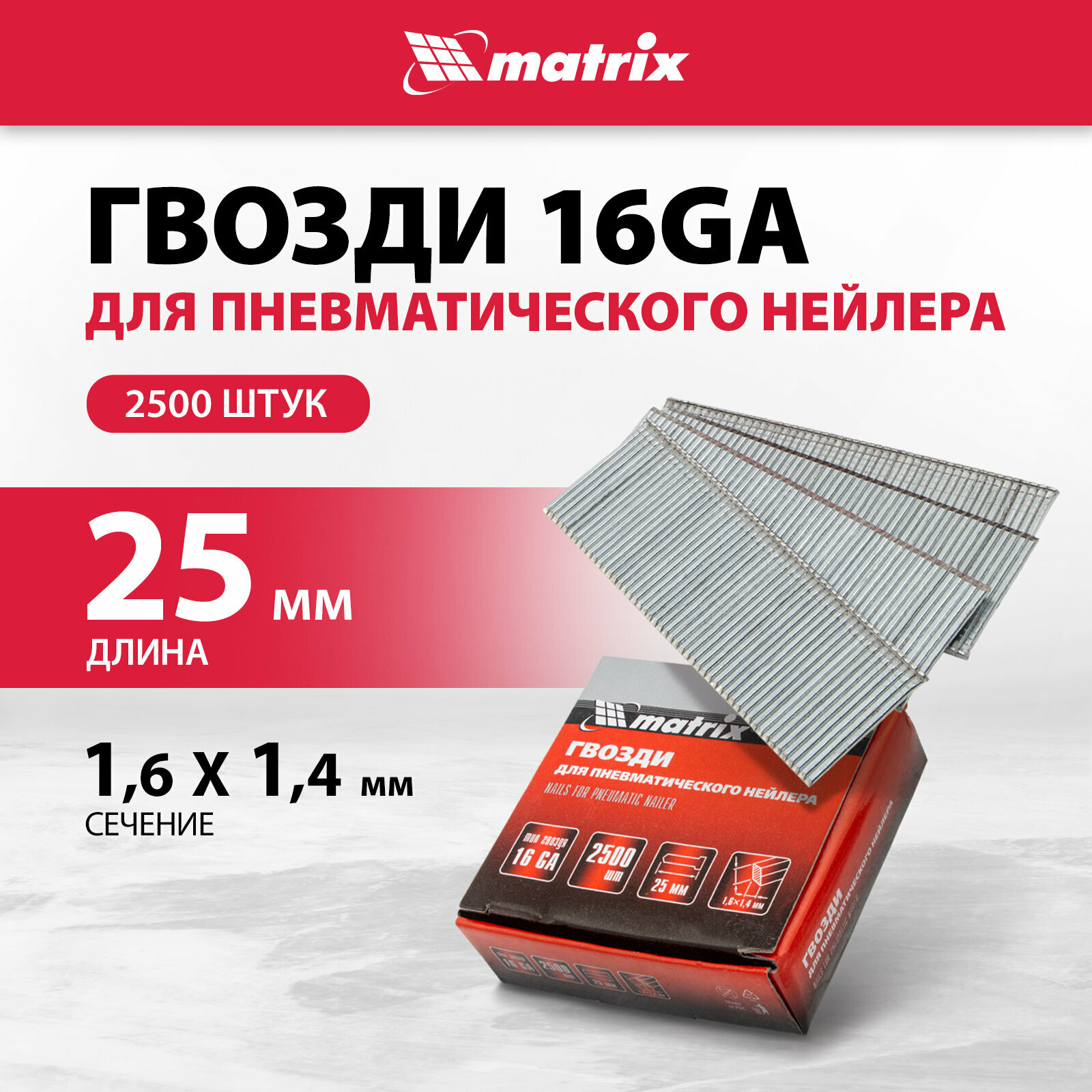 Гвозди Matrix 16GA для пневм. нейлера сечение 1,6х1, 4, длина 25 мм, 2500 шт 57603 информация: