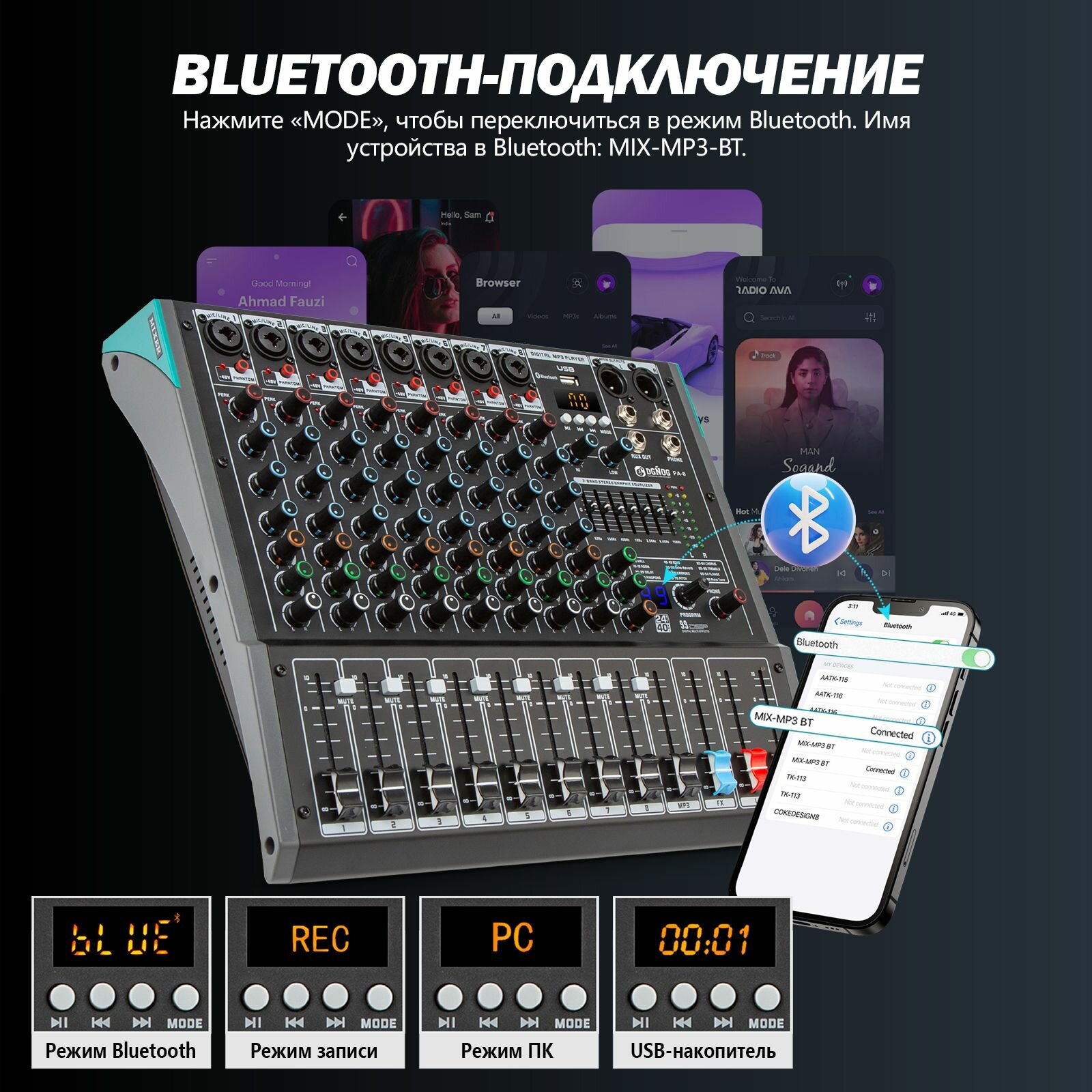 10 цен на Микшер DGNOG, PA-8, аналоговый, 8 каналов, фантомное +48В, Bluetooth, чёрный