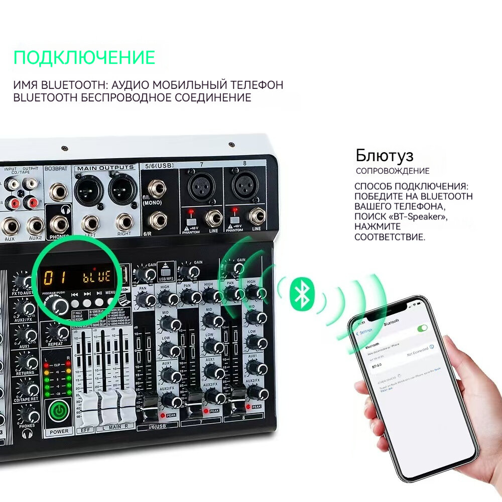 KP8 Аудиомикшер 8-канальный микшерный пульт Bluetooth Звуковая плата USB Реверберация для ПК Stage Studio DJ Sound Controller KP8 информация: