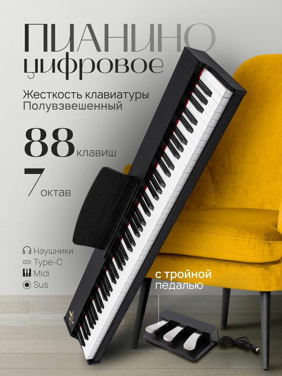 Цифровое пианино 88 клавиш bluetooth, 880 тембров, 600 ритмов, три педали, деревянный корпус, MIDI/USB, черный