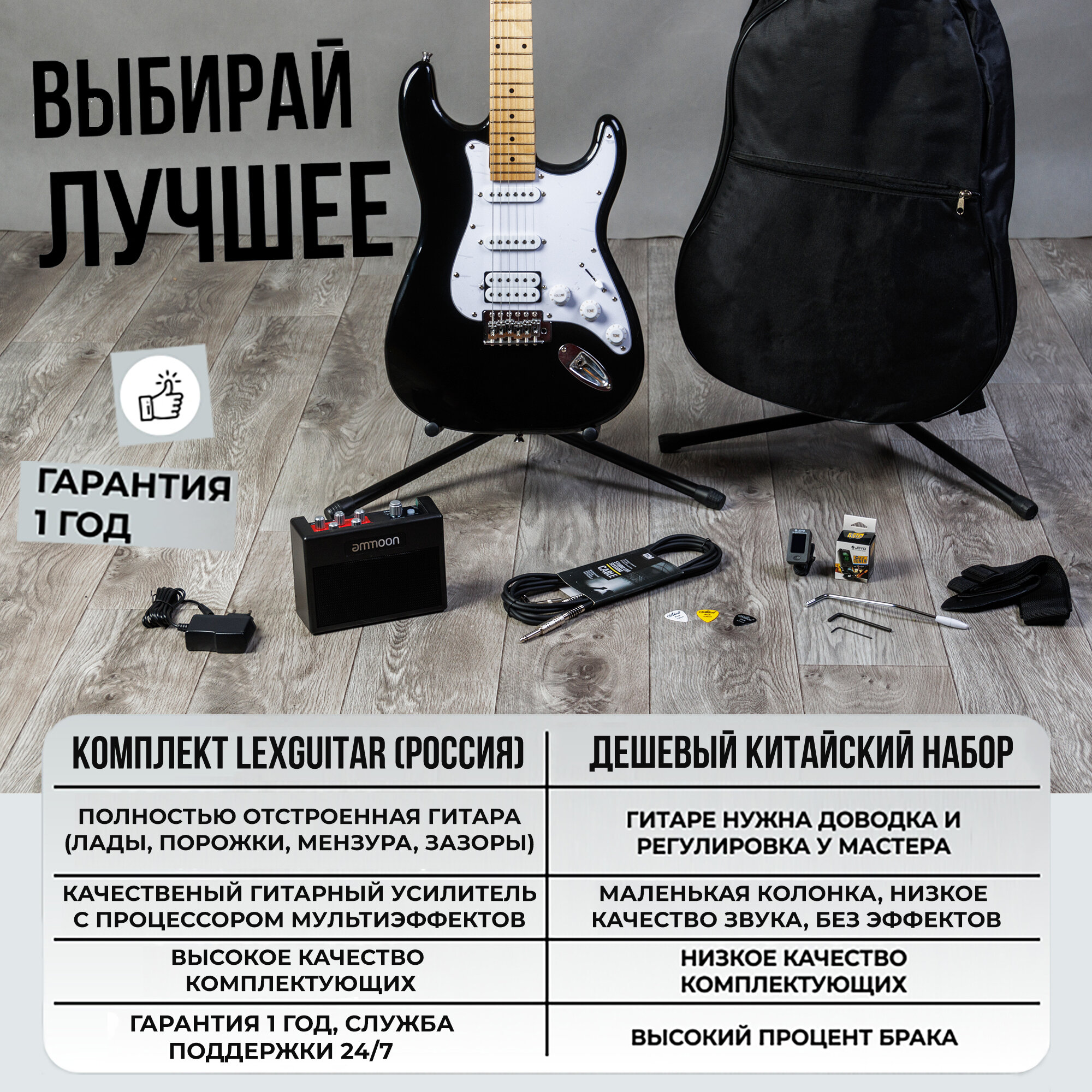 Характиристики этого товара не найдены!Отзывы на Комплект 8 в 1 Электрогитара с комбоусилителем, Lexguitar Stratocaster Black White Super