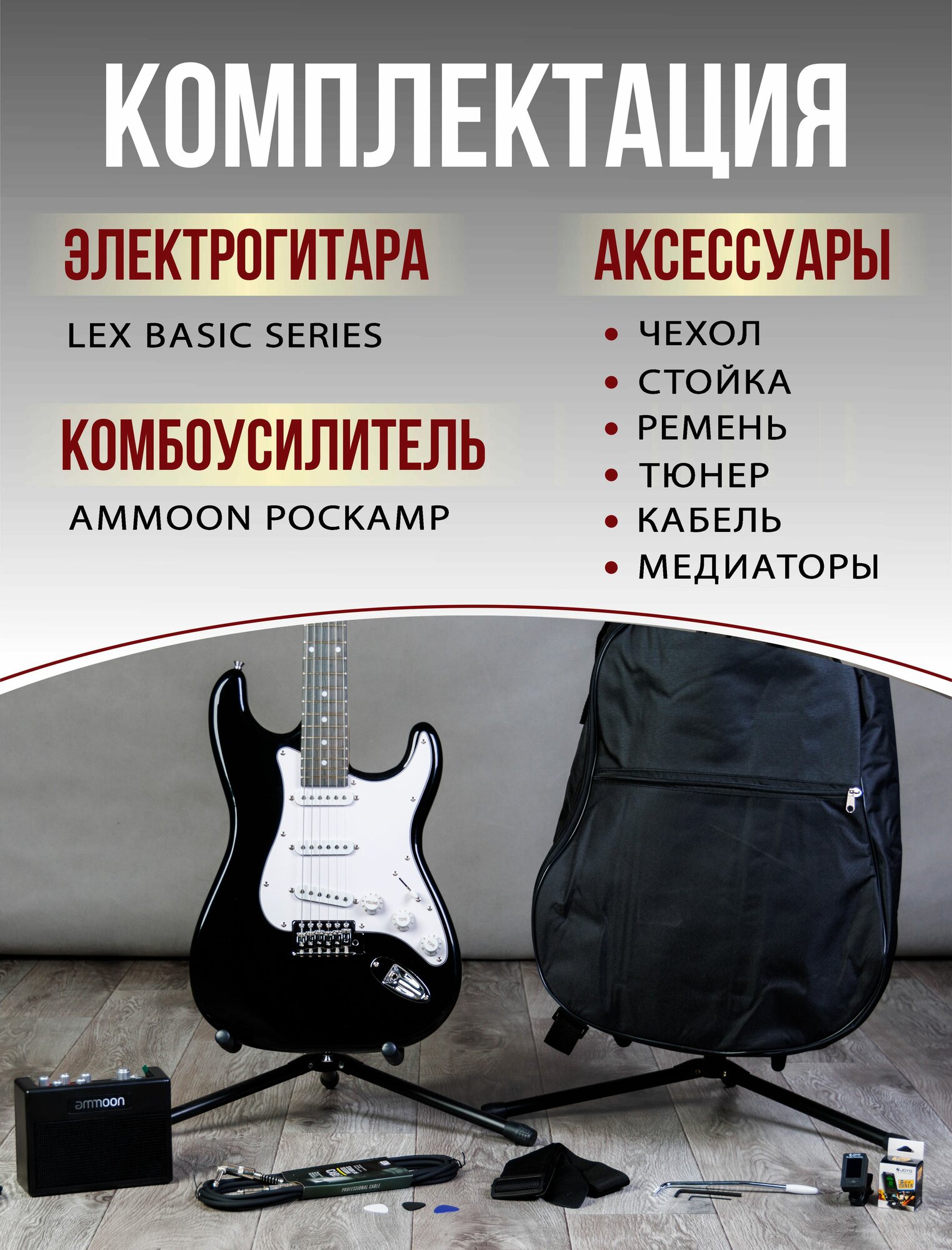 Комплект 8 в 1 Электрогитара с комбоусилителем, Lexguitar Stratocaster BlackWhite информация: