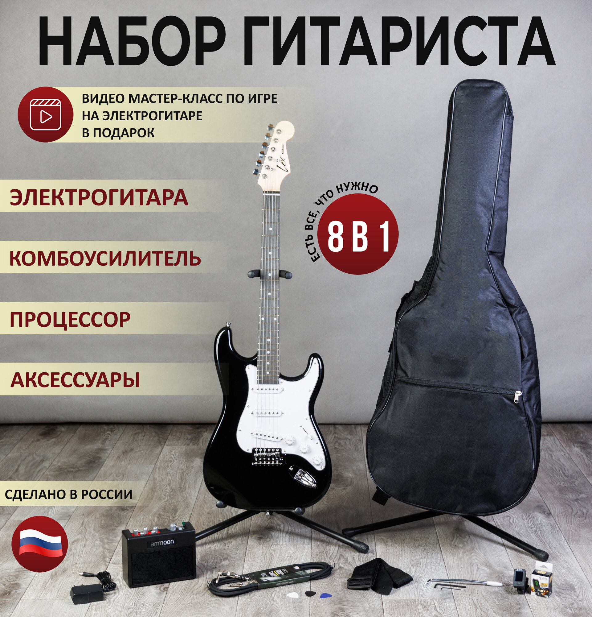 10 цен на Комплект 8 в 1 Электрогитара с комбоусилителем, Lexguitar Stratocaster BlackWhite