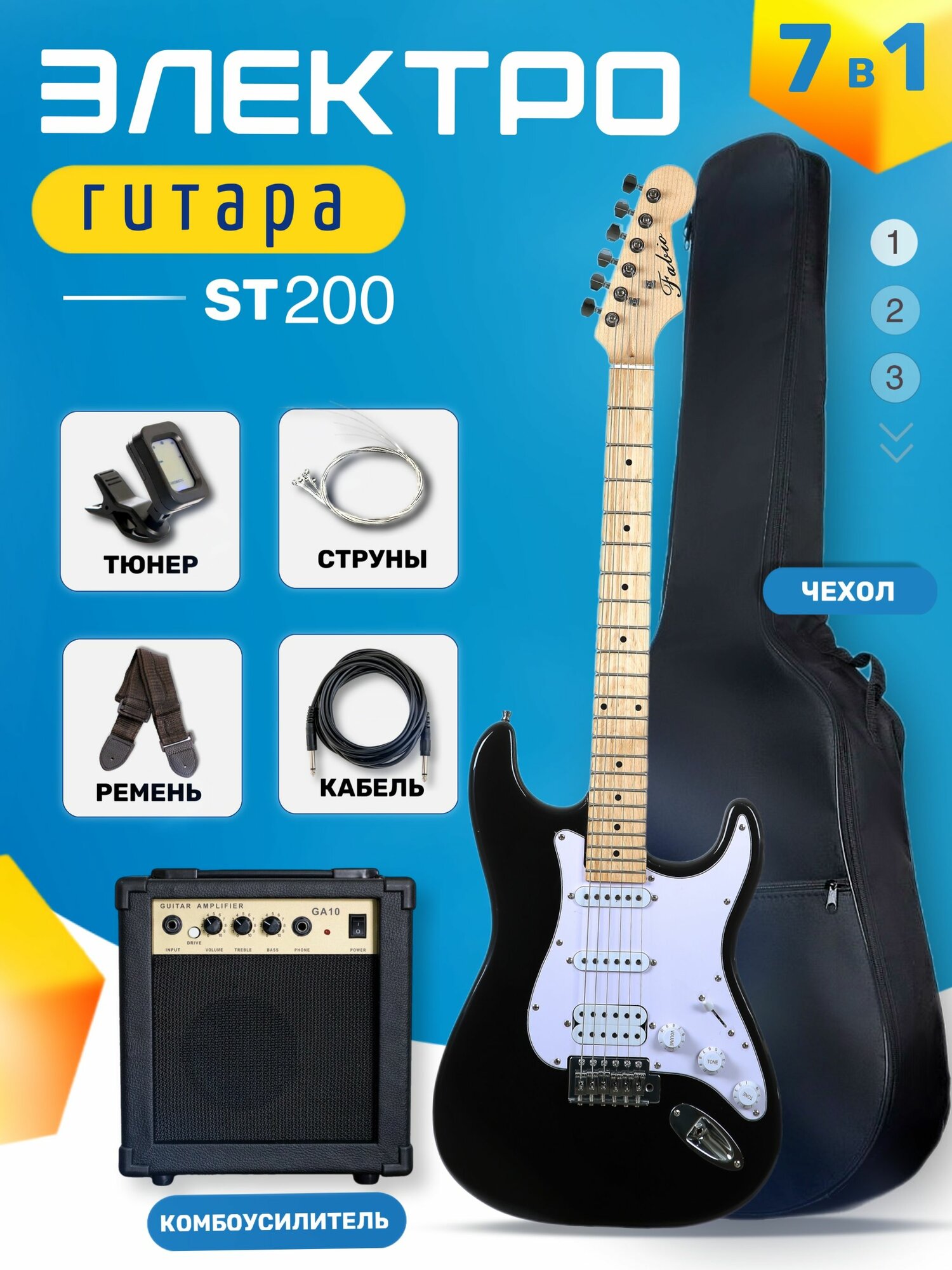10 цен на Электрогитара Stratocaster Чёрная Fabio ST200 BK H+S+S, 1V+2T (Набор электрогитара с комбоусилителем)