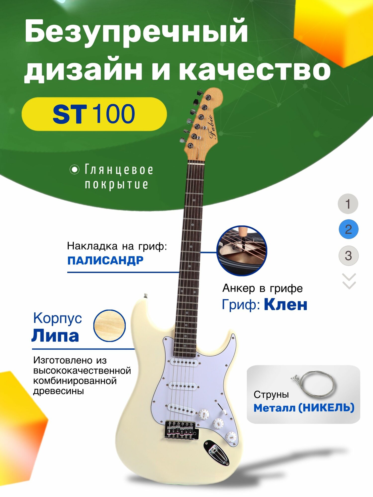 Электрогитара Stratocaster Белая Fabio ST100 WH S-S-S, 1V+2T (Набор электрогитары с комбоусилитем) информация:
