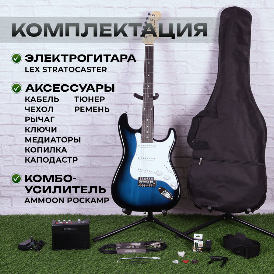 Комплект 10 в 1 Электрогитара с комбоусилителем, Lexguitar Stratocaster Blue Sunberst информация: