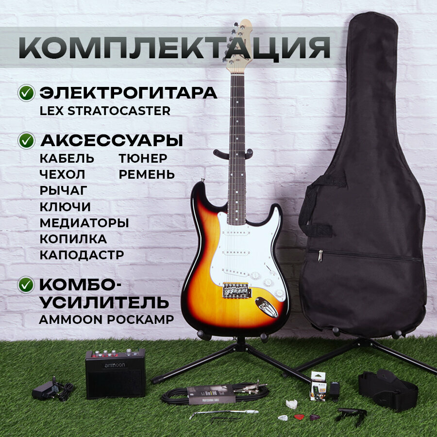 10 цен на Комплект 10 в 1 Электрогитара с комбоусилителем, Lexguitar Stratocaster Sunberst