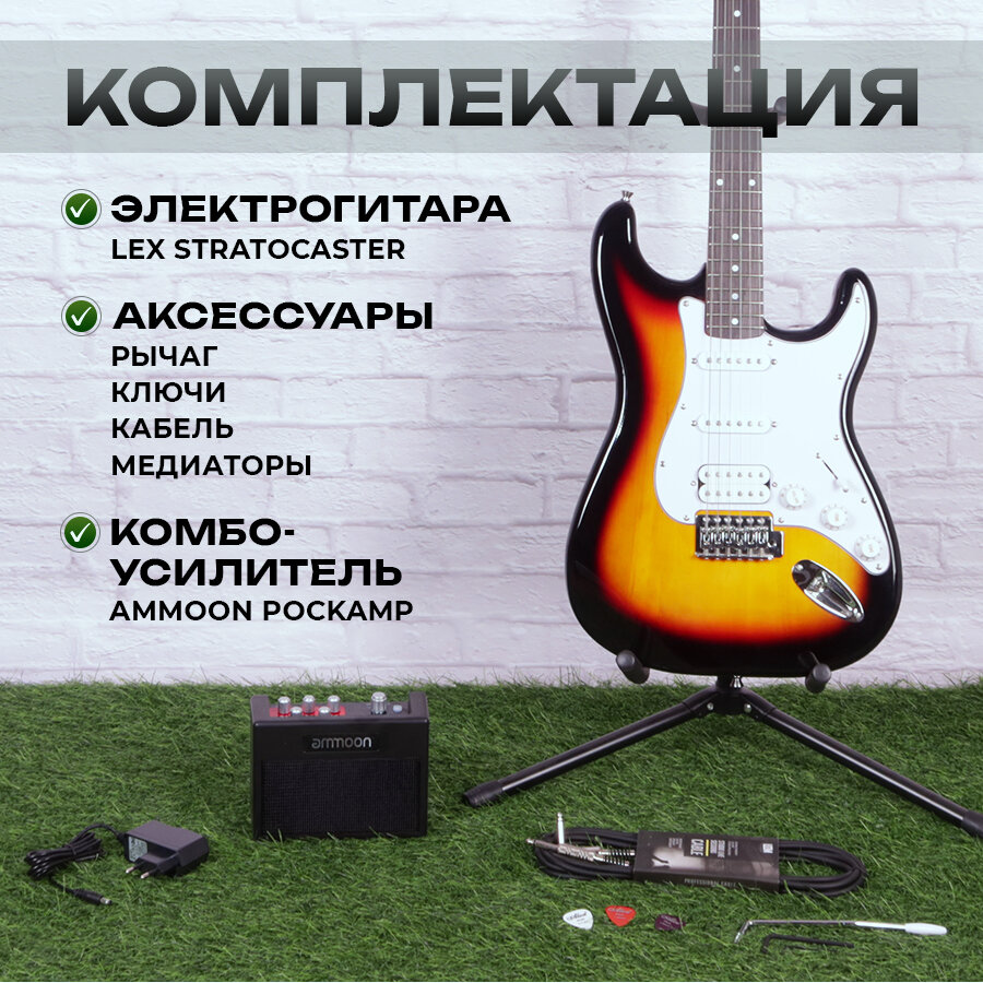10 цен на Комплект 5 в 1 электрогитара Lex Sunberst Super Stratocaster, комбоусилитель с процессором эффектов, аксессуары