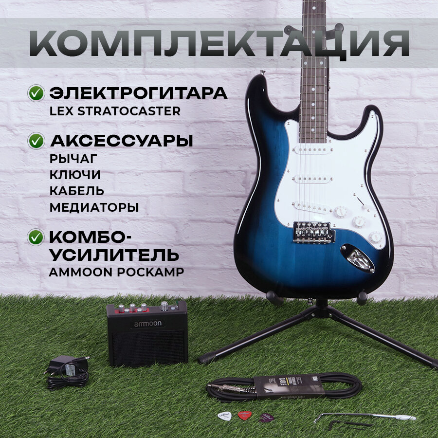 Комплект 5 в 1 электрогитара Lex Blue Sunberst Stratocaster, комбоусилитель с процессором эффектов, аксессуары информация: