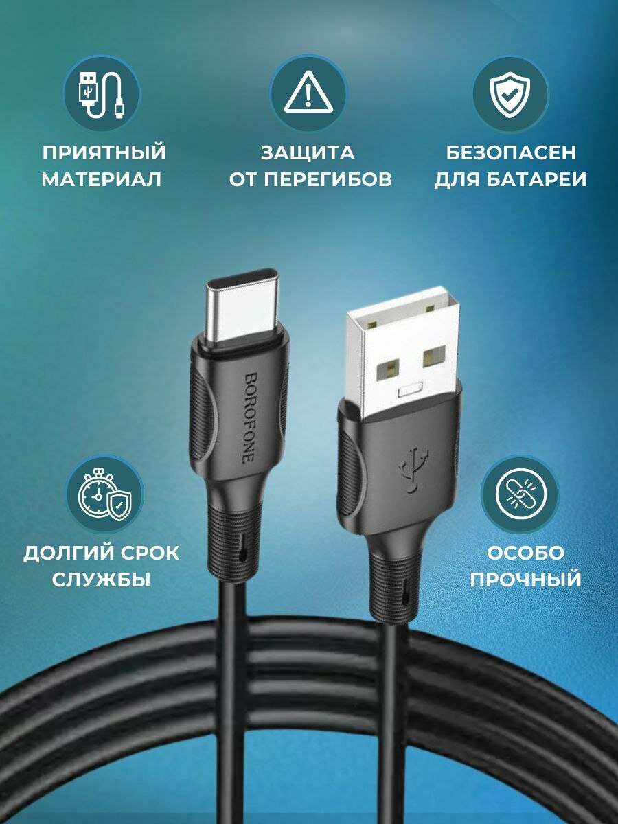 Кабель для зарядки USB TYPE-C 3А 1М BOROFONE Провод особо прочный Защита от перегрева информация: