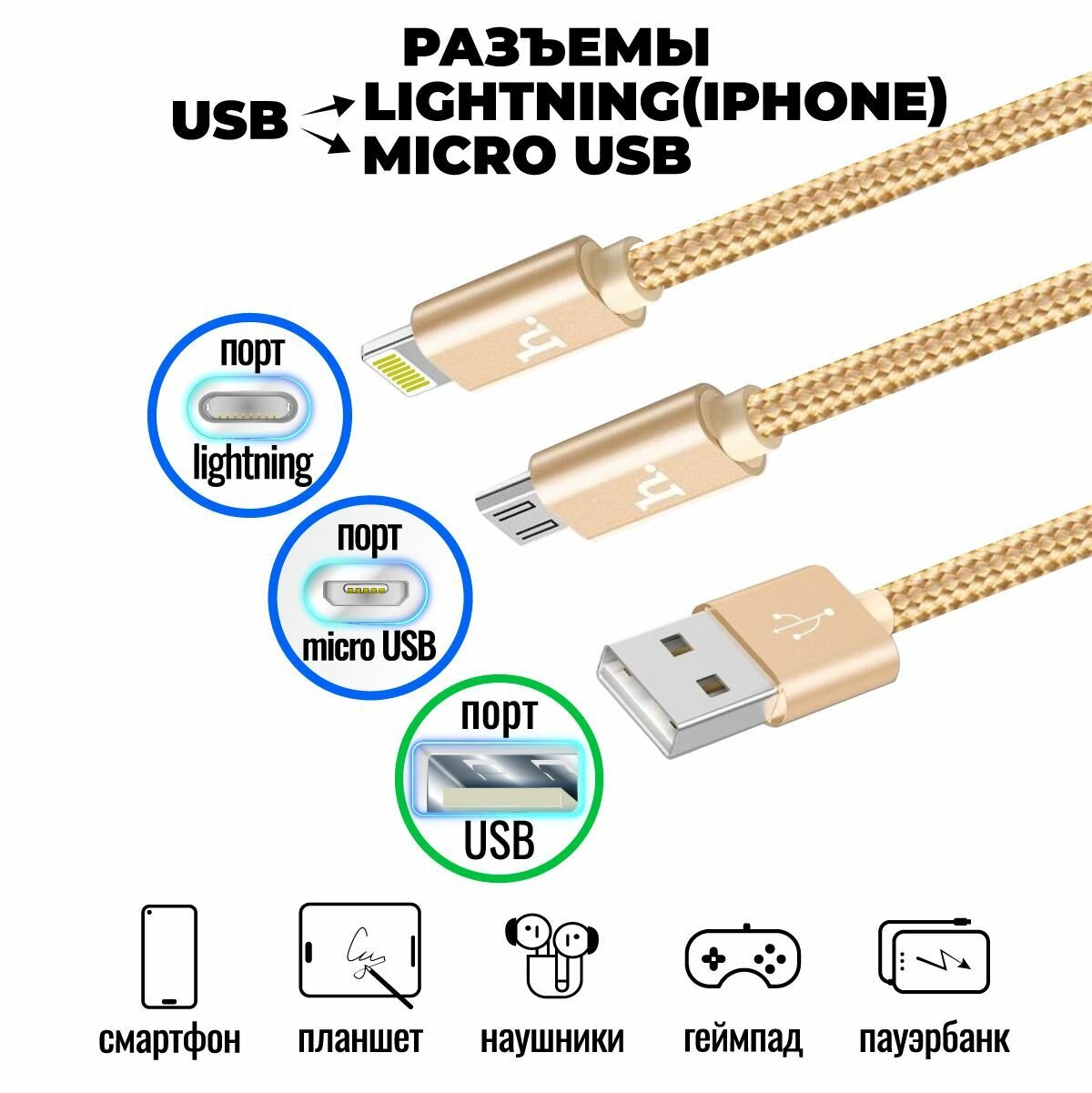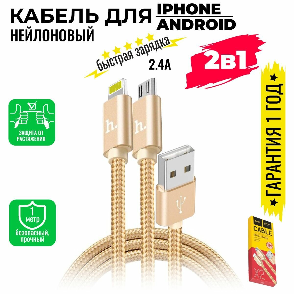 Отзывы на Кабель для iPhone / Андройд, 2 в 1, быстрая зарядка, 1 метр, нейлоновый, передача данных / micro USB провод для iPad airPods / Hoco. X2