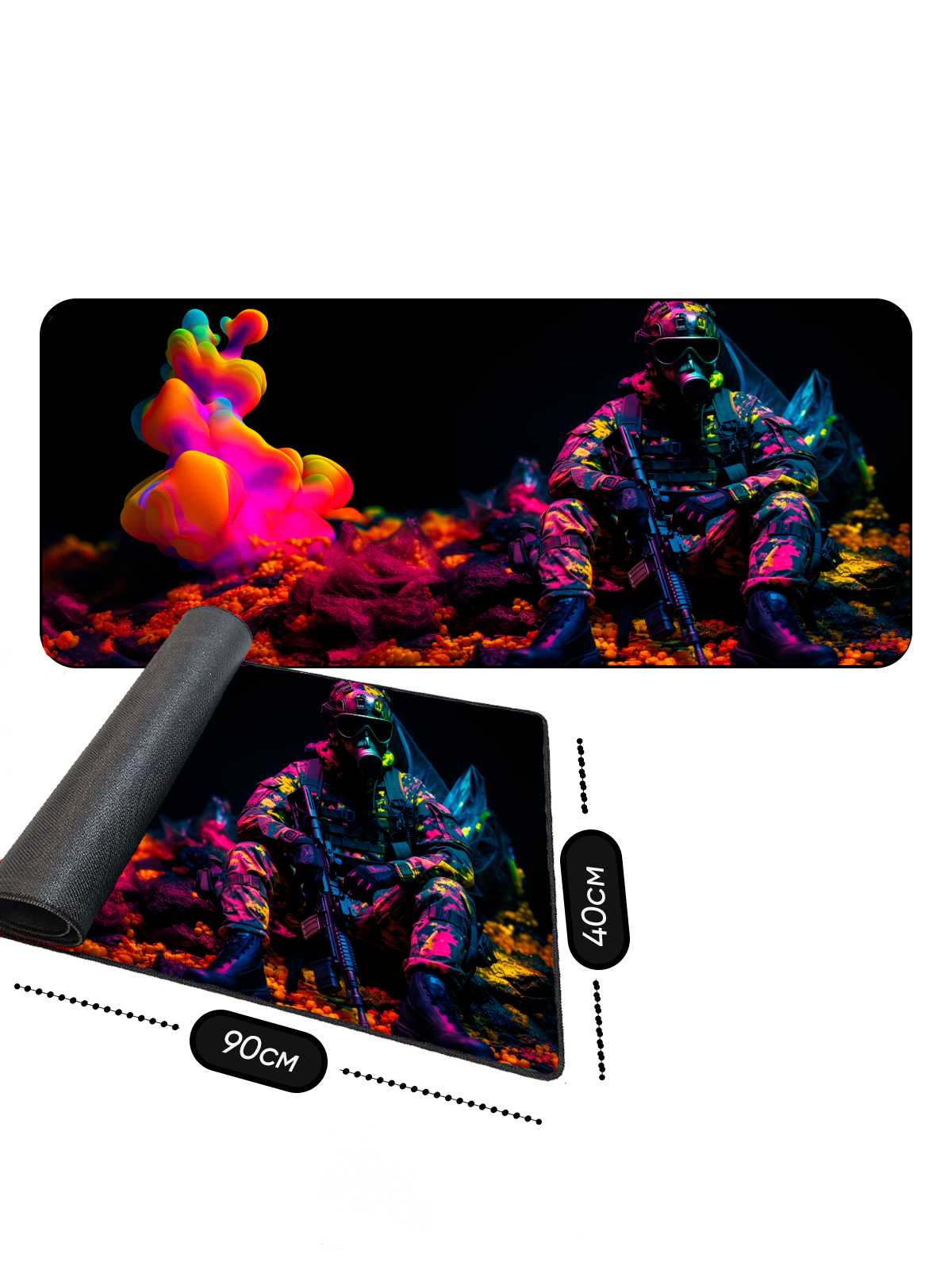 Большой игровой коврик для мышки с принтом, 90х40 см, Солдат в экипировке. Компьютерный ковер 3D дизайн, под клавиатуру и мышь на весь стол. информация: