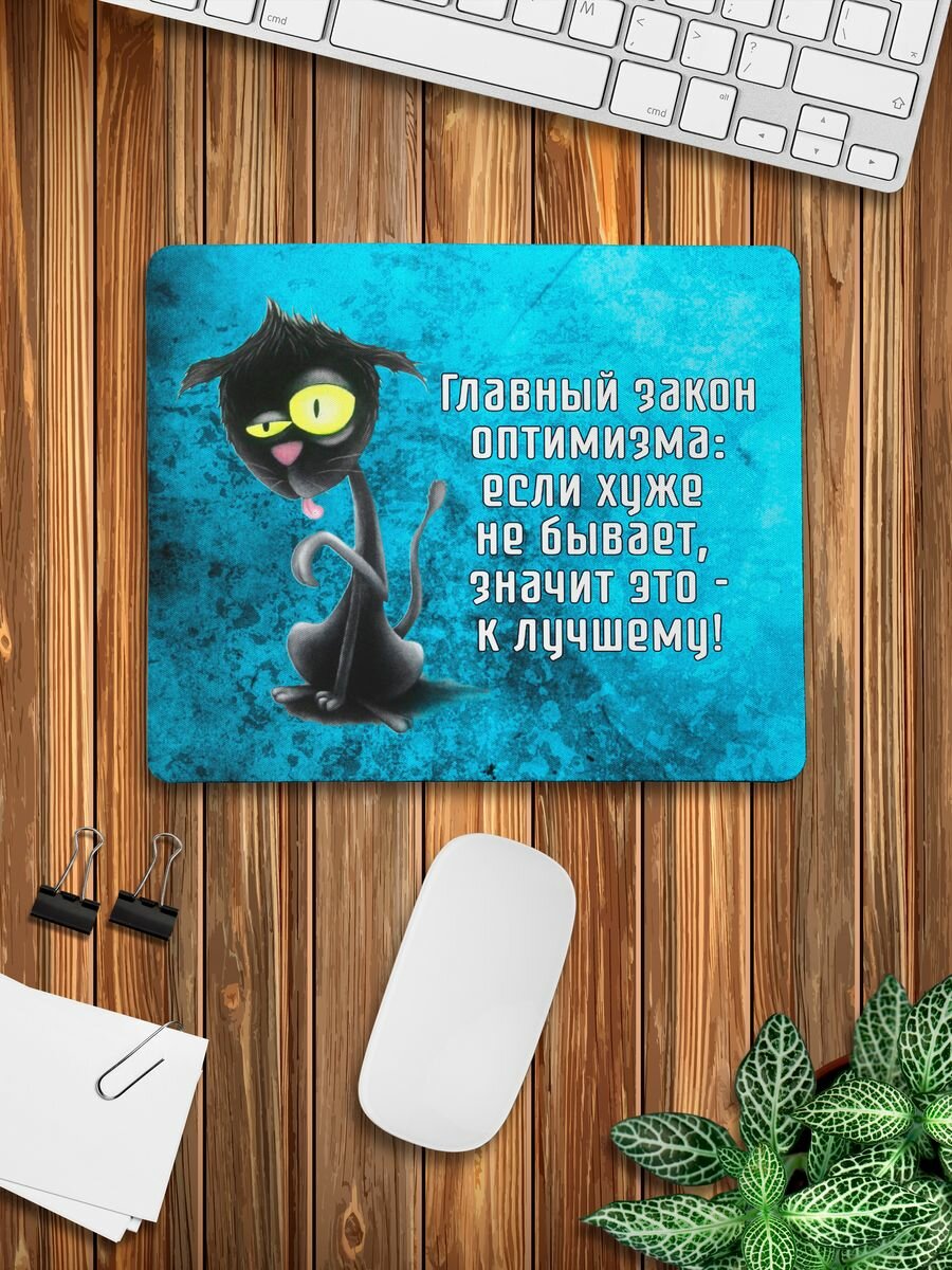 Коврик для компьютерной мыши Кот закон оптимизма, игровой, нескользящая основа, 23х19х0.4 см информация: