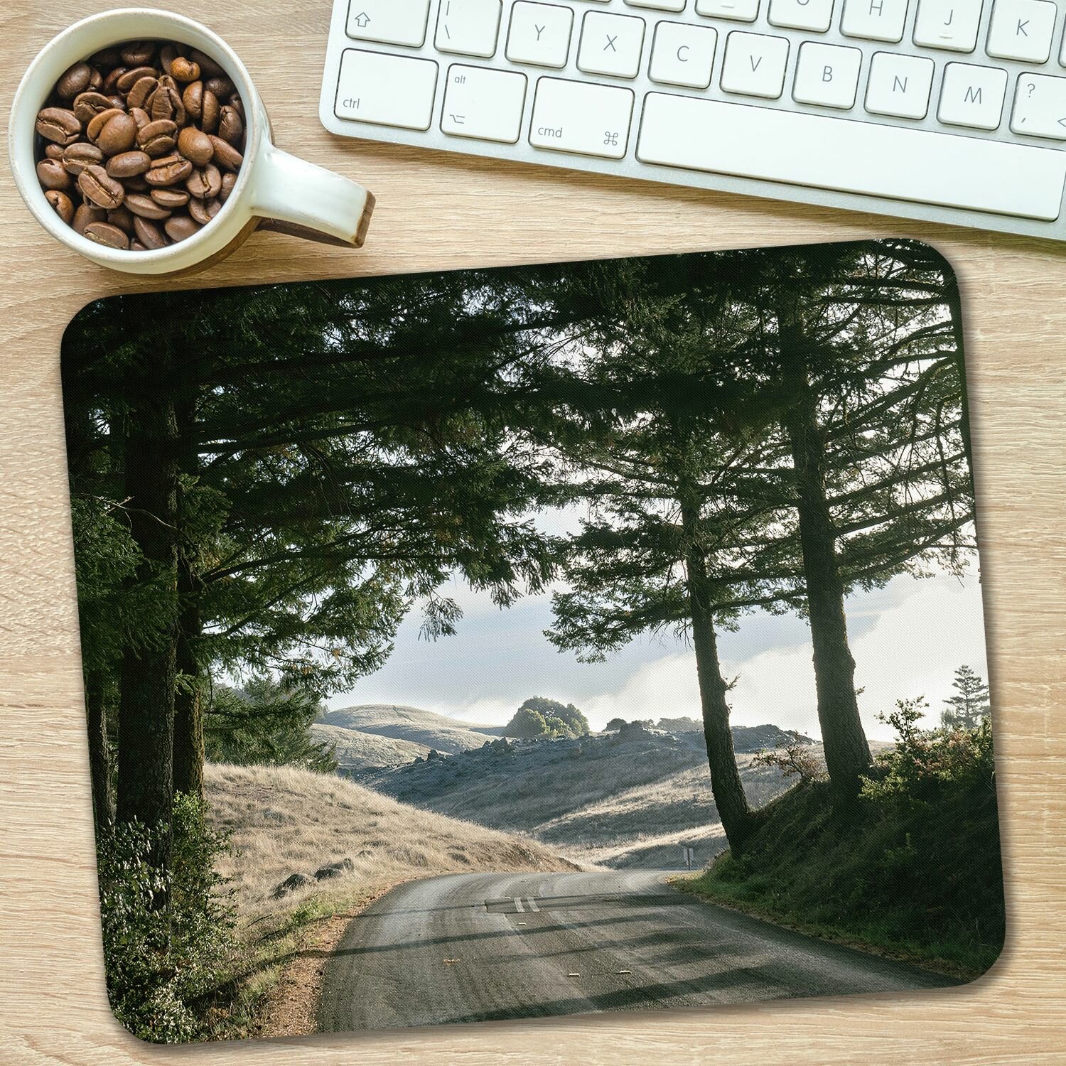 10 цен на Коврик для мыши "Извилистая дорога в лесу с утренним листом и холмами"