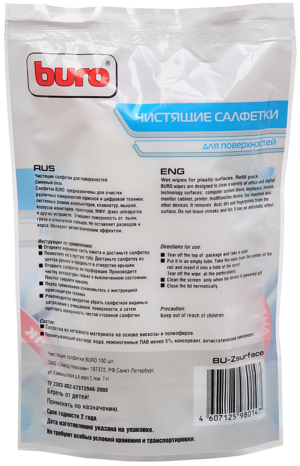 Чистящее средство Buro Чистящее средство влажные салфетки Buro BU-Zsurface запасной блок, для поверхностей (100шт./уп.) информация: