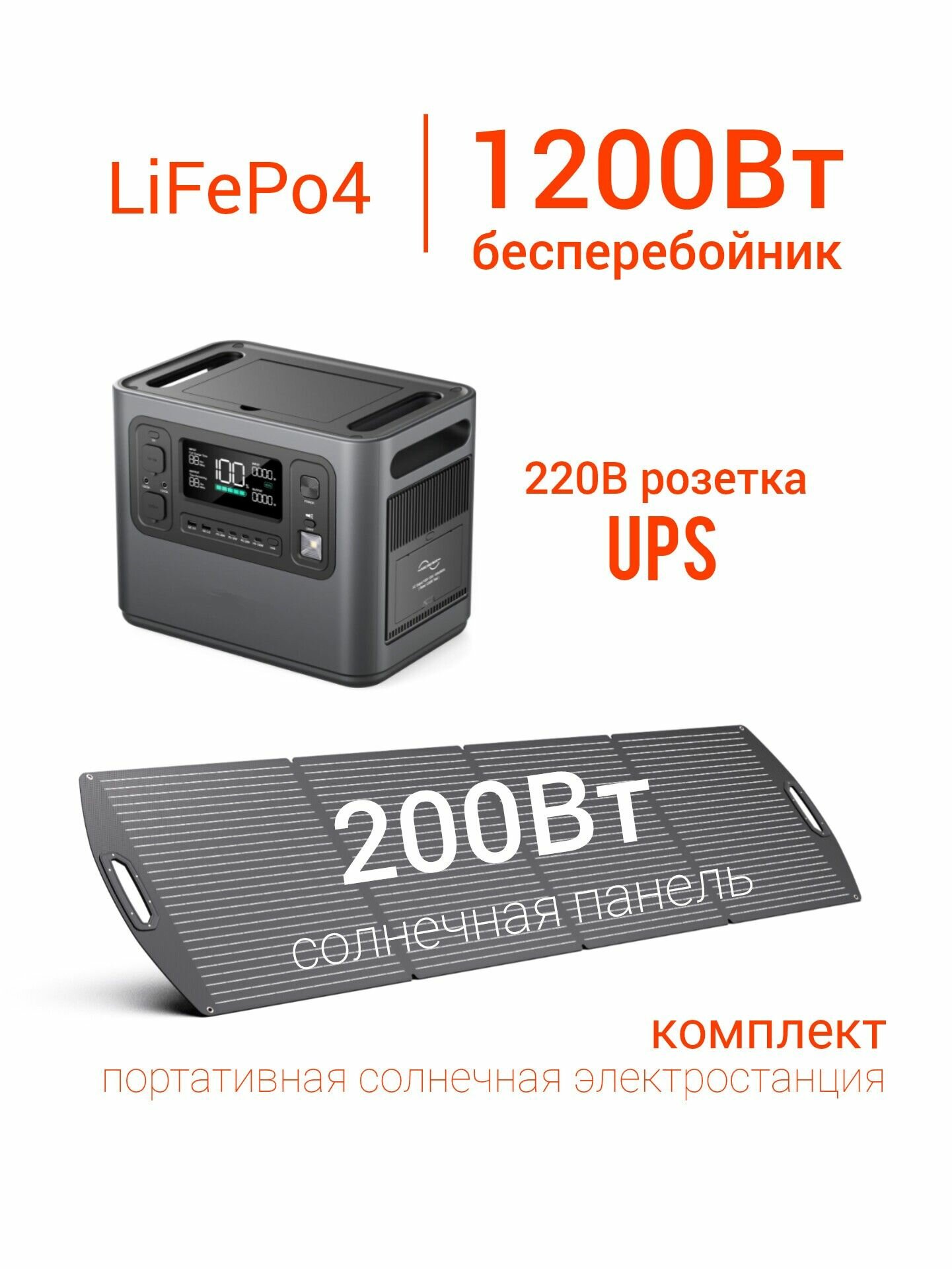 Комплект LiFePo4 бесперебойник ИБП 1200Вт 220В розетка + солнечная батарея 200Вт зарядная станция портативная электростанция 220 в аккумулятор насоса газового котла дома, дачи, холодильника, роутера информация: