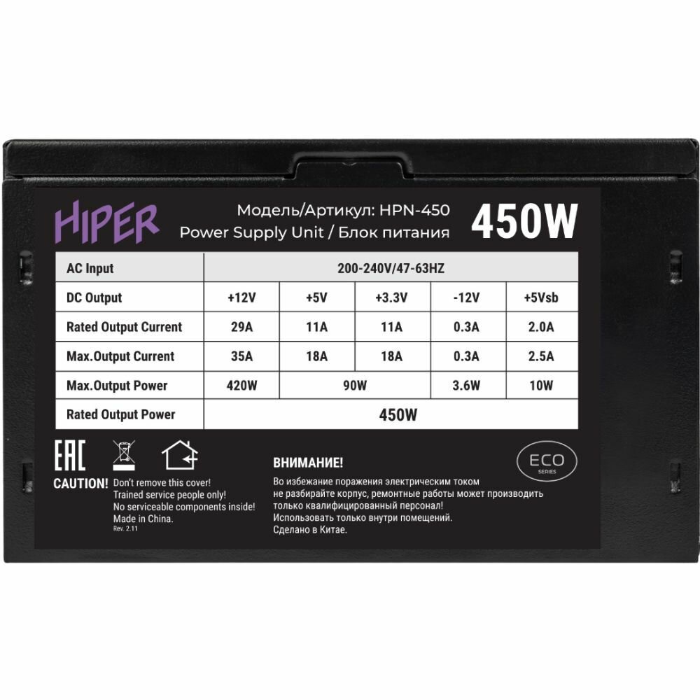 Блок питания для ПК HIPER ECO 450W (HPN-450) информация:
