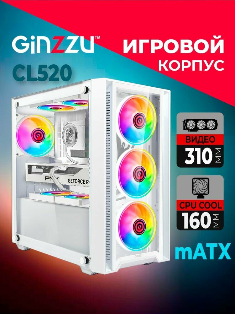 Корпус Ginzzu CL520 mATX закаленное стекло боковая и передняя панель информация: