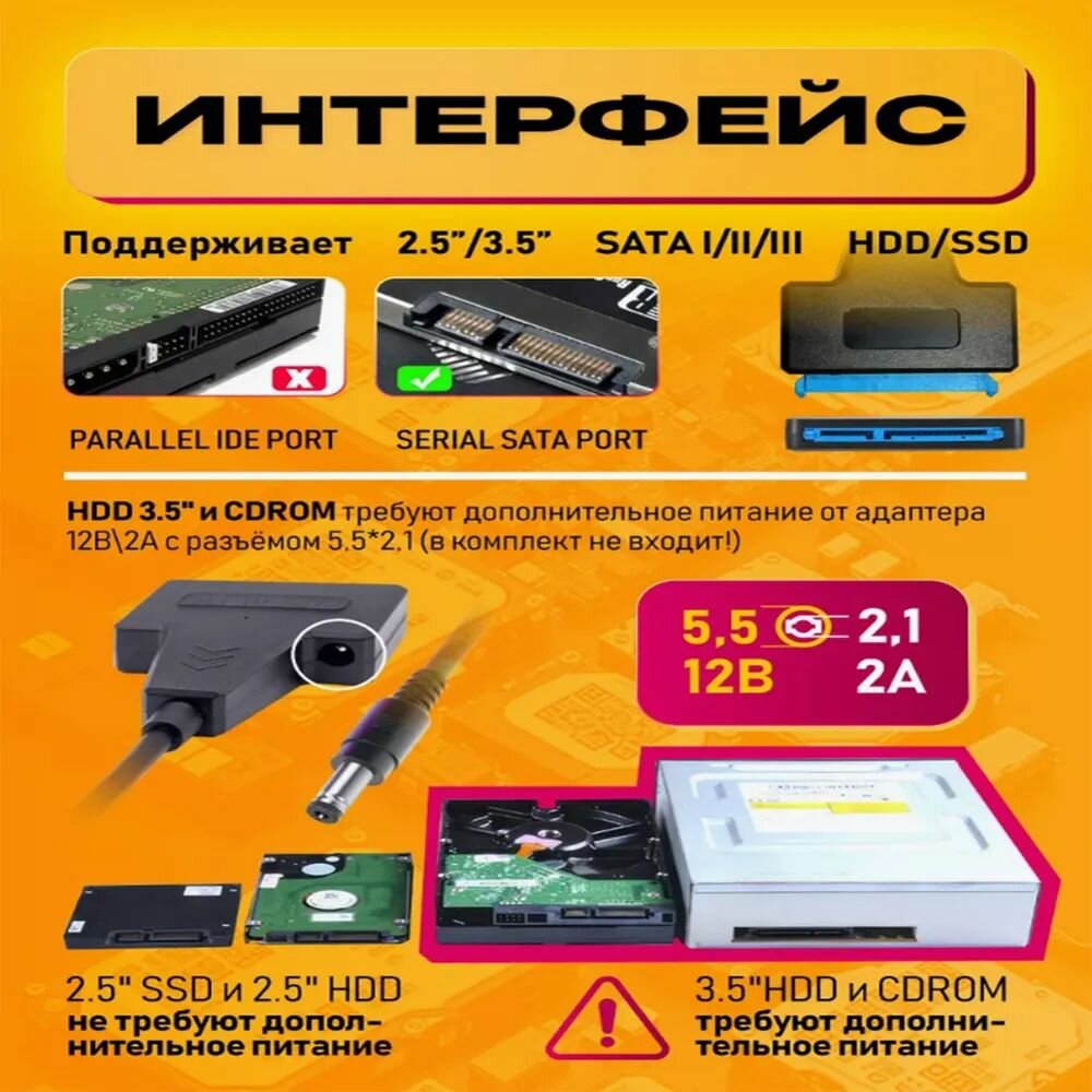 Переходник SATA - USB 2.0 для HDD 2.5, 3.5, SSD, черный + 15pin адаптер для жесткого диска информация: