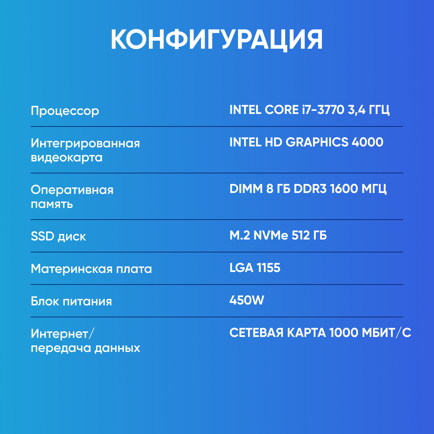 Системный блок Компьютер офисный ПК (Intel Core i7-3770 (3.4 ГГц), RAM 8 ГБ, SSD 512 ГБ, Windows 10), чёрный матовый информация: