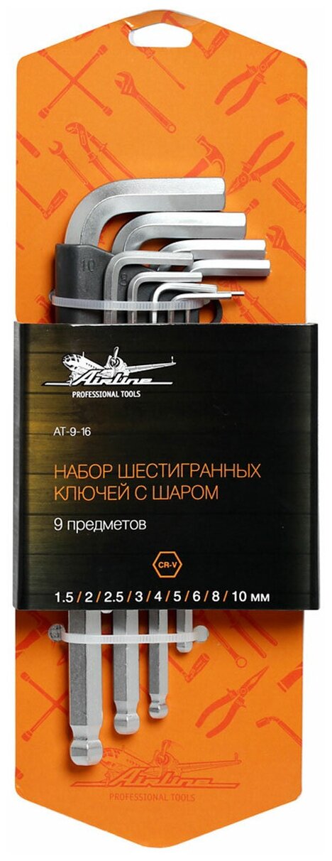 AIRLINE at-9-16 (AT916) набор шестигранных ключей инбус с шаром 9 предметов (1.5 2 2.5 3 4 5 6 8 10мм) пласт.подвес