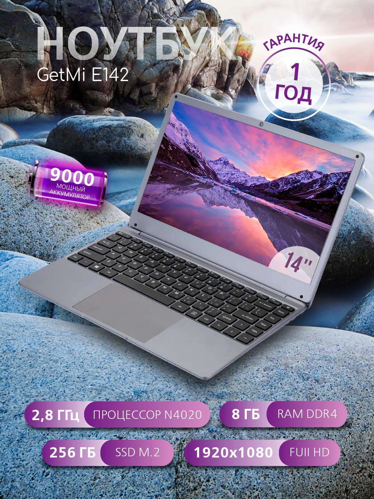Ноутбук для учебы GetMi Е142 14" FullHD IPS, Celeron N4020 (2,8 Ггц), 8Гб DDR4, 256Гб SSD, Win 11 pro + Office (актив) информация: