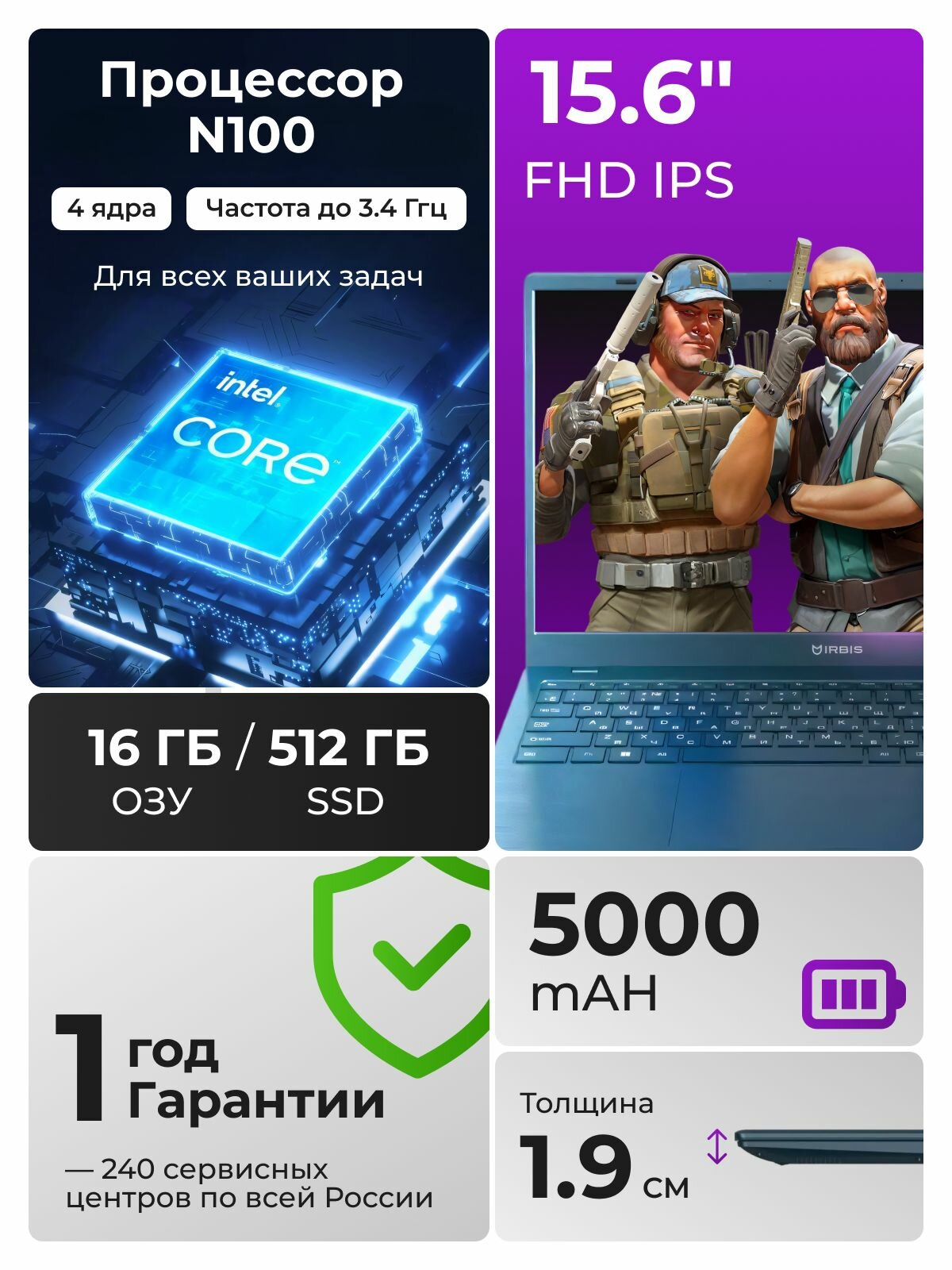 Ноутбук 15.6" IRBIS Breeze, Intel N100, RAM 16ГБ, 512ГБ SSD, Intel UHD, FHD IPS 1920x1080, Windows 11 Pro информация: